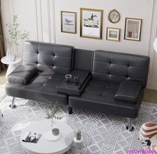 Convertible Futon Sofa Bed: Convert from a sofa to a comfy bed in just a few seconds with the removable arm pillows and adjustable backrests for a cosy rest in your living room! Seating for 2: With a weight capacity of up to 500lbs, this stylish futon sofa allows you to lounge in comfort while preventing your favourite drink with the cup holder in the middle!