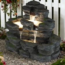 Relaxing Water Flow: Enjoy the soothing water flow as it cascades down each layer, mimicking the sound of a real waterfall. The six white lights on the rockery outdoor waterfall fountain cast a soft and cozy glow, enhancing the overall atmosphere.