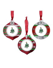 This 3PCS Christmas Tree Ornaments Set Picture Frame Ornament is a holiday keepsake gift that features a red and green color scheme, perfect for the Christmas season. Made of metal, these hanging ornaments come with a ribbon for easy decorating. The set in...