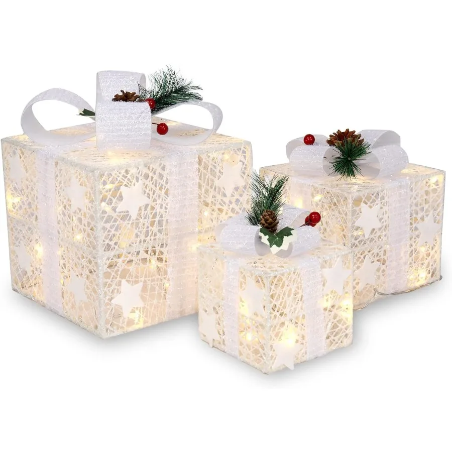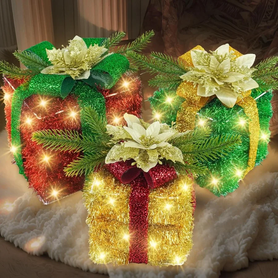 3pcs Lighted Christmas Gift Boxes with Timer and Poinsettias for Indoor Outdoor Decorations Green Red Golden Holiday Table Cent