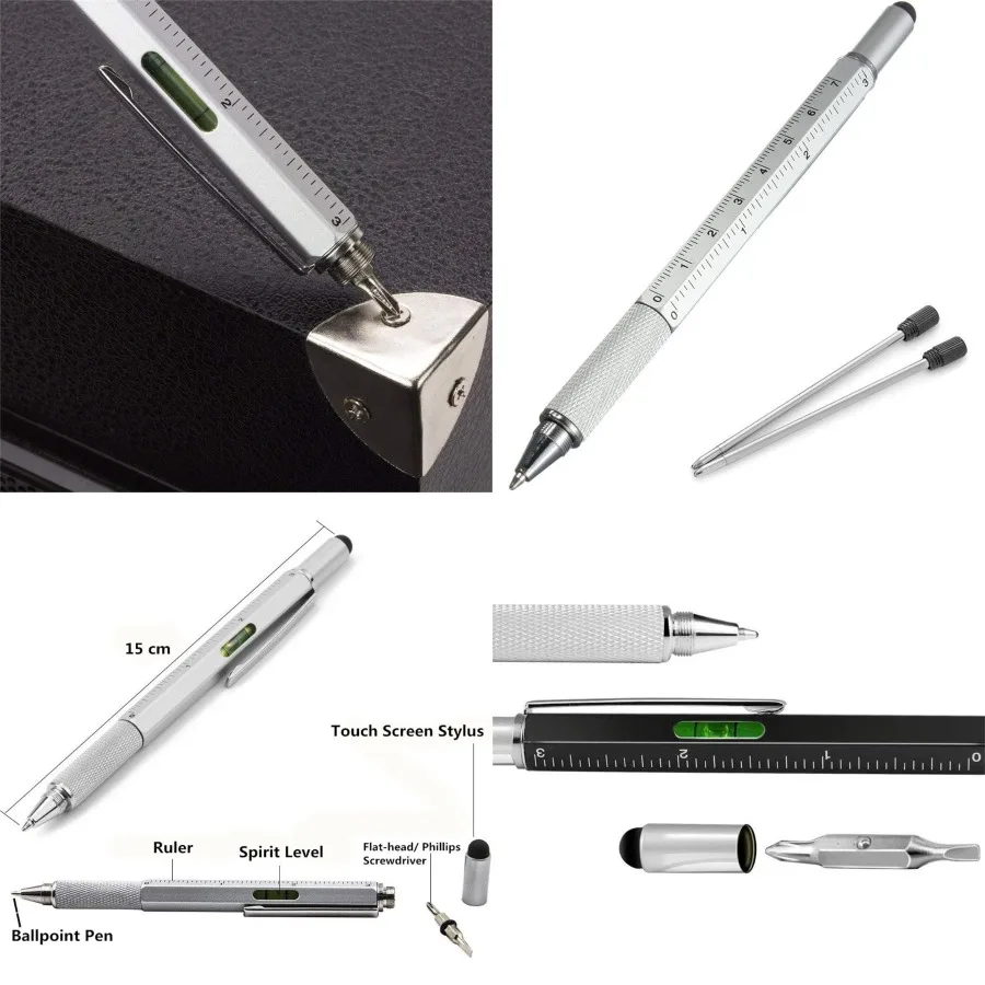 6 in 1 Multifunction Tech-Tool Pen with Ink Refills for Office and Outdoor Use - Includes Ballpoint Pen Touch Screen Stylus Rul