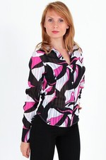 A blouse of a fitted silhouette in black and maroon divorces. V-neck and a standing-turn collar are ideal for classic jackets. Button closure and hinges. Length approx. Composition: 60% viscose, 40% polyester.