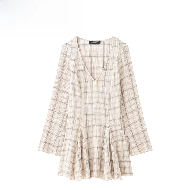 Spring New Arrival ZR Women's Fashionable Plaid Short Dress Versatile Design High Waist Polyester Fiber Long Sleeve Casual Wear