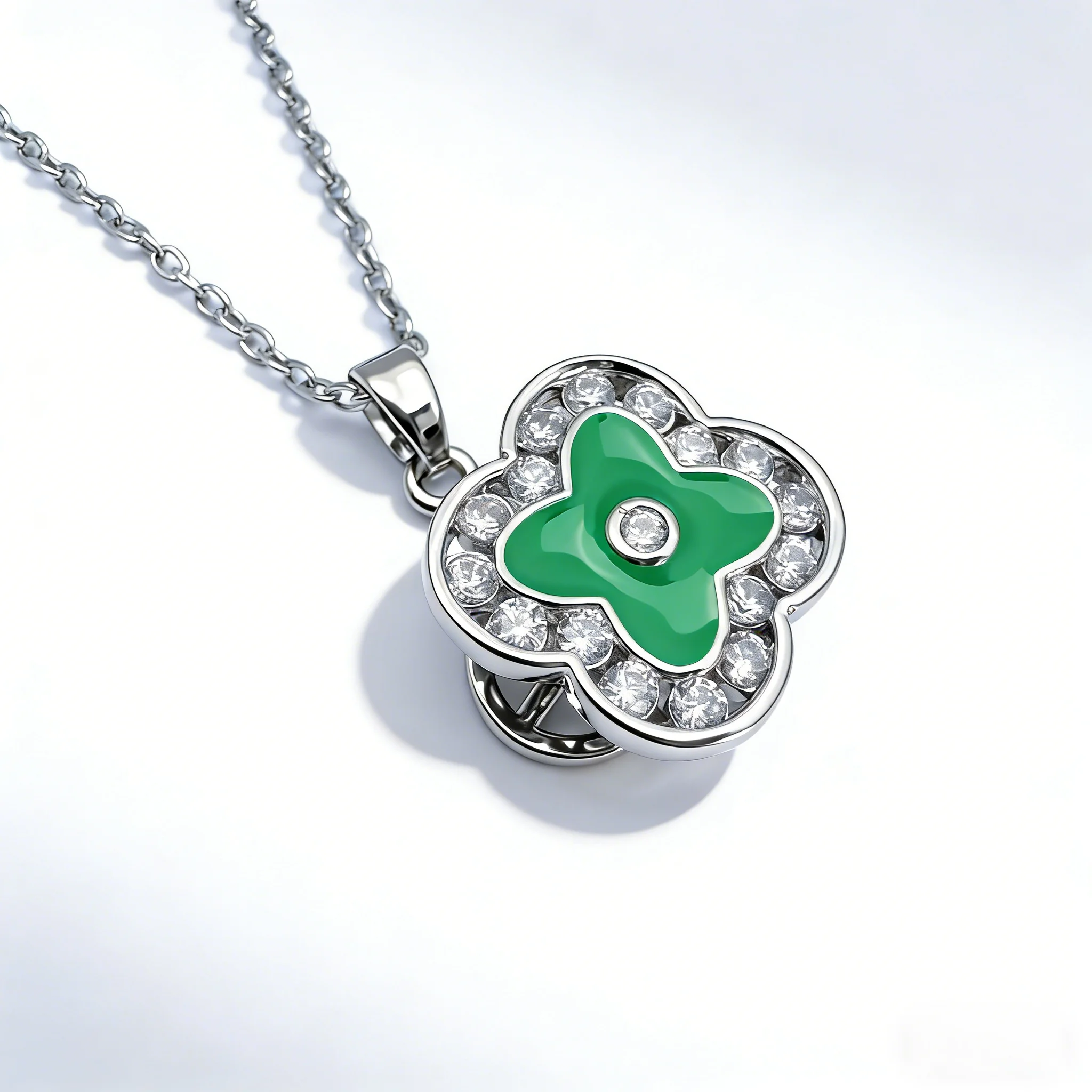 Elegant Rotatable Floral Pendant Necklace Green Enamel Zircon Inlaid Silver Plated Clavicle Chain Women's Fashion Jewelry Gift