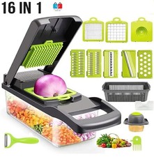 The 16-in-1 Veggie Chopper Veggie Slicer is a versatile kitchen item that includes a slicer, lid, and food slicer, all in one convenient set. Made of stainless steel and plastic. This grey-colored tool is designed specifically for slicing vegetables. It fe...